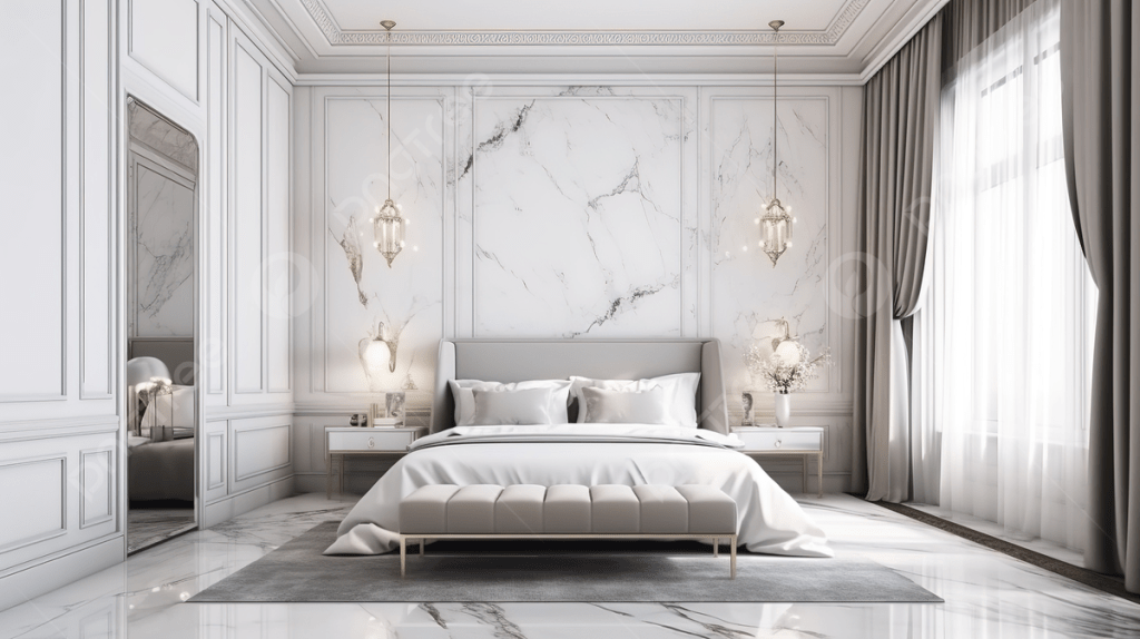 - White Marble (Marmer putih) – Mengadopsi material marmer putih pada finishing dinding atau lantai kamar tidur Anda akan memberikan kesan mewah sekaligus sederhana. Warna putih merupakan ciri khas warna bangunan klasik eropa dan juga bangunan modern masa kini. Jika Anda menyukai marmer namun ingin tetap terlihat sederhana, maka pilihlah marmer berwarna putih.