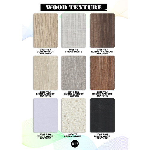 - Wood Grain – Memiliki corak kayu bergradasi yang terdiri dari warna plain – bright – deep. Anda dapat menemukan motif kayu Zebrano, Maple, ataupun Ebony.
