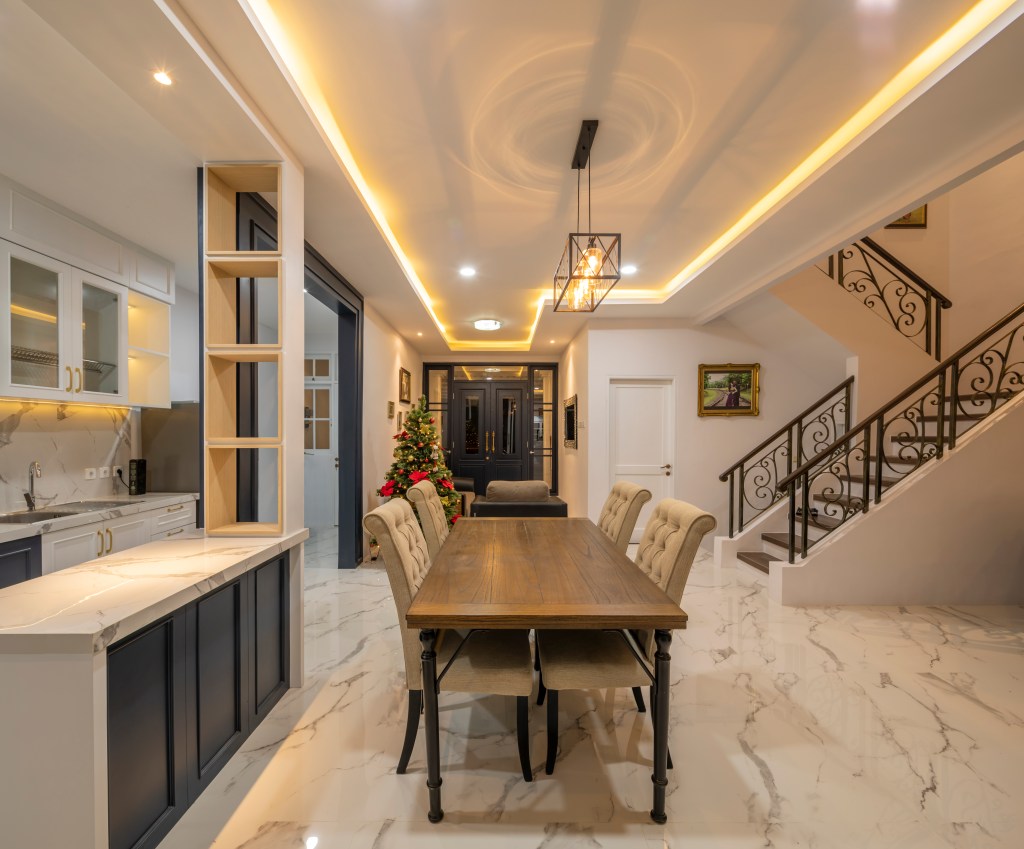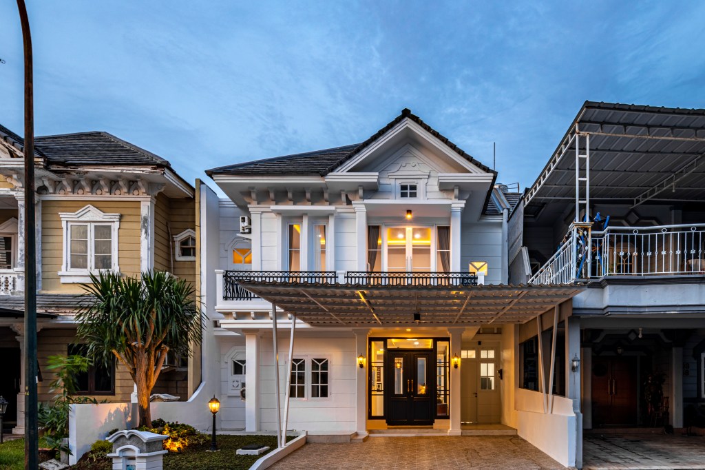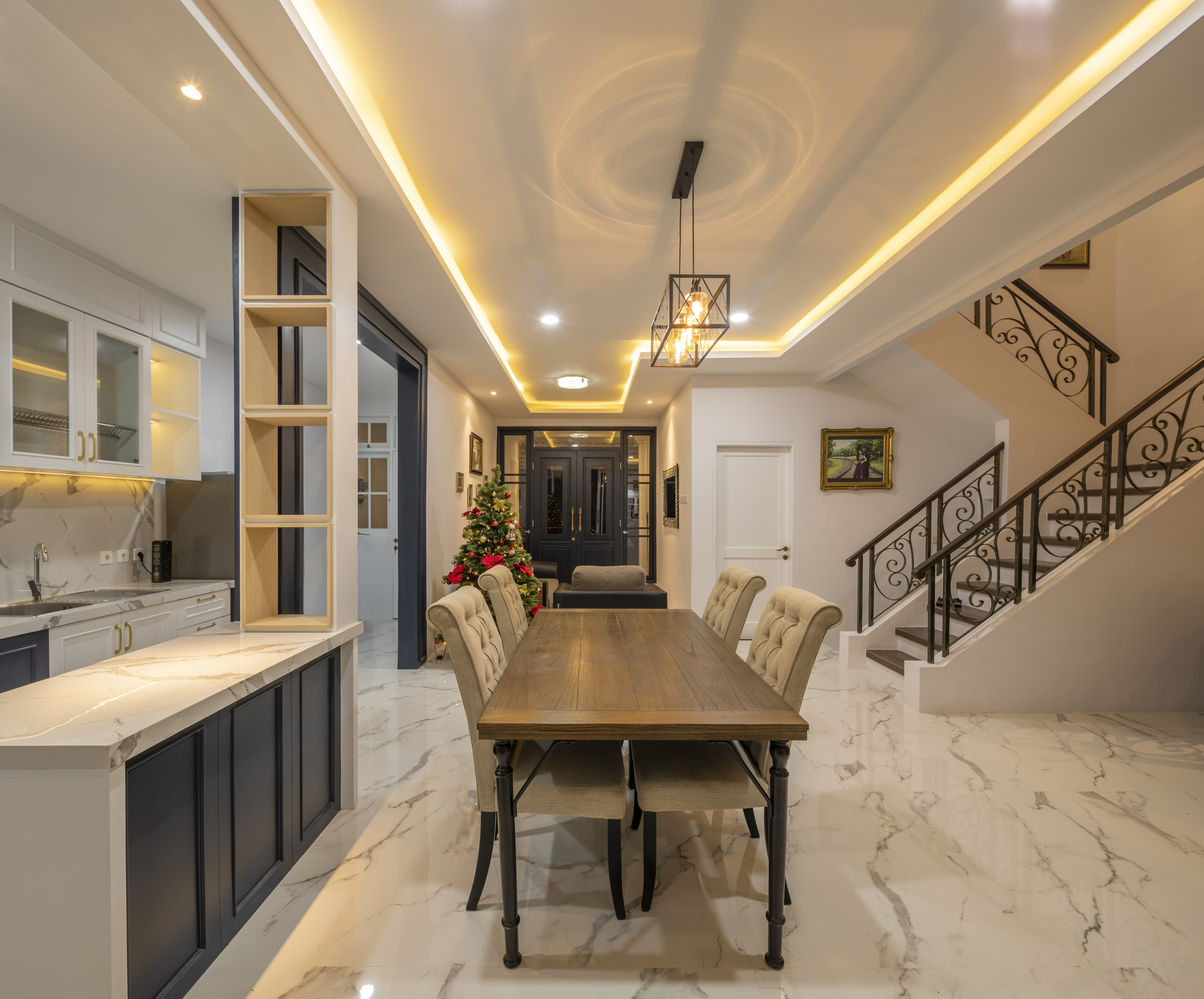 Rumah tinggal Mr. V mengadopsi style Modern Classic sebagai exterior maupun interior nya. Berlokasi di Kota Wisata, Cibubur, Mr. V melakukan design & build baik exterior maupun interior nya bersama Tigaperspektif. Elemen classic ditonjolkan pada kusen jendela, kusen pintu, profile atap maupun kolom.